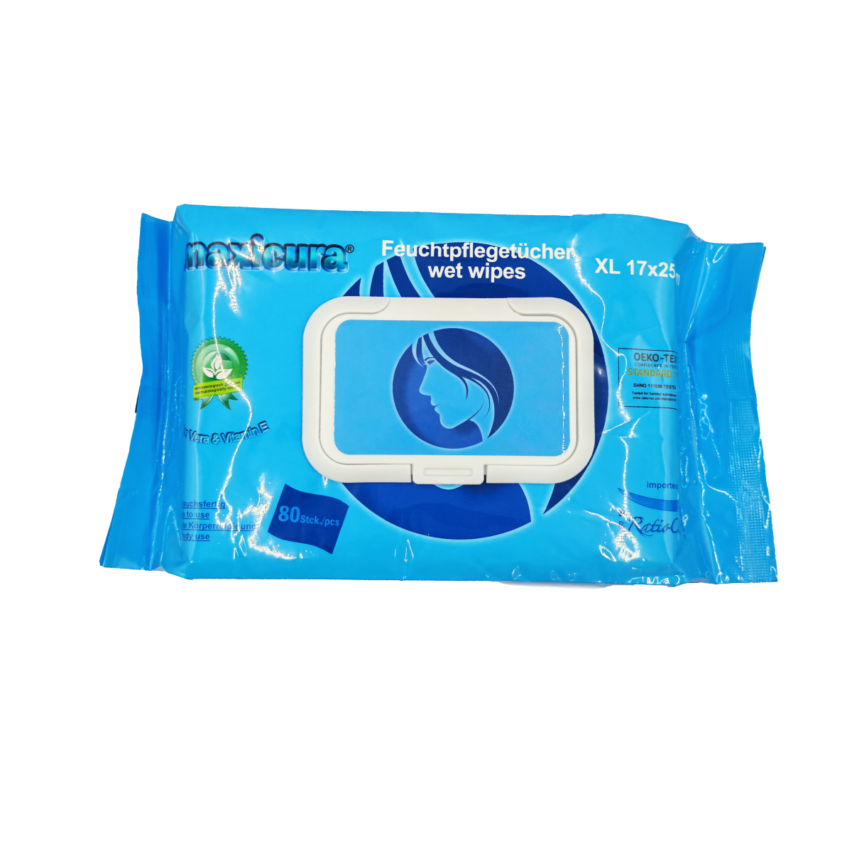 maxicura® feuchte Pflegetücher in einer wieder verschließbaren Verpackung, Karton mit 24 Spenderboxen mit je 80 Tücher