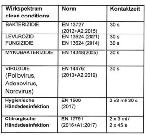 Wirkungsbereich: Bakterizid, Levurozid, Fungizid, Mykobakterizid, Viruzid (Poliovirus, Adenovirus, Norovirus)